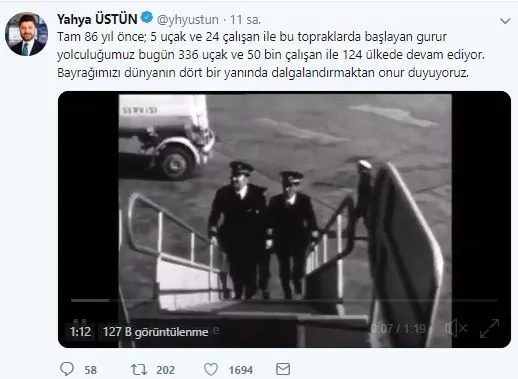THY Basın Müşaviri Yahya Üstün, konuya ilişkin yaptığı açıklamada, "Tam 86 yıl önce 5 uçak ve 24 çalışan ile bu topraklarda başlayan gurur yolculuğumuz bugün 336 uçak ve 50 bin çalışan ile 124 ülkede devam ediyor. Bayrağımızı dünyanın dört bir yanında dalgalandırmaktan onur duyuyoruz." ifadelerini kullandı.