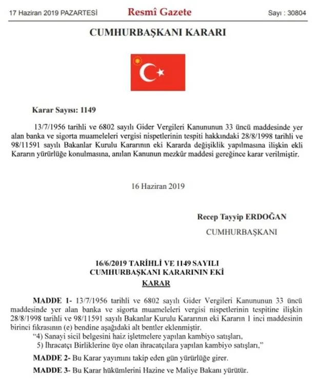 Başkan Recep Tayyip Erdoğan'ın dün ihracatçılar için açıkladığı kambiyo vergisine ilişkin karar Resmi Gazete'de yayımlandı ve yürürlüğe girdi.