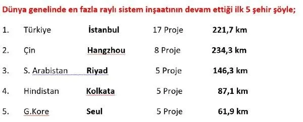 Dünyada toplu taşımacılık sektörünün en seçkin kuruluşlarından biri olan Uluslararası Toplu Taşımacılar Birliği (UITP), dünya genelinde toplu taşımacılığa dair tüm çalışmaları yakından takip edip kayıt altına alıyor. UITP'nin verilerine göre dünya genelinde yapımı devam eden raylı sistem hatları incelendi. Buna göre, 17 farklı raylı sistem inşaatının devam ettiği İstanbul'un, "Aynı anda en fazla raylı sistem inşaatının devam ettiği şehirler sıralamasında" dünyada birinci sırada olduğu tespit edildi.