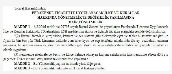 Ticaret Bakanlığı'nın Perakende Ticarette Uygulanacak İlke ve Kurallar Hakkında Yönetmeliği Resmi Gazete'de yayımlandı. Yönetmeliğe göre bazı eşyalardaki taksit 18 aya çıktı.