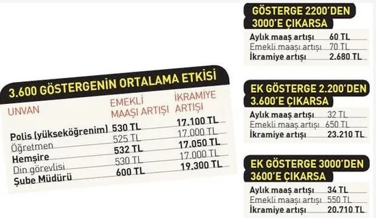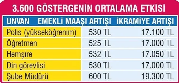 Ortalama olarak polislerde emekli maaşı 500 lira, ikramiye ise 17 bin lira; öğretmenlerde de en az emekli maaşı artışı 500 lira olacak ve ikramiyelerdeki artış 13 bin lirayı geçecek. Ek göstergesi 2200'den 3600'e çıkacak personelde ise artış 20 bin lirayı geçecek. Dördün birinci derecesindeki 25 yıllık 3000 göstergedeki bir memurun 77 bin liralık ikramiyesi 3600 ek göstergede 94 bin liraya çıkacak. 30 yıllık kıdemdeki memurda ikramiye 92 bin liradan 113 bin liraya yükselecek.