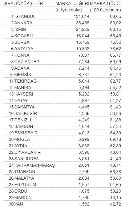 Türkiye'de 30 büyükşehir arasında 131,6 milyar dolar marka değeri ile İstanbul ilk sırada yer alırken bunu 35,5 milyar dolarla Ankara, 24,2 milyar dolarla İzmir takip etti.