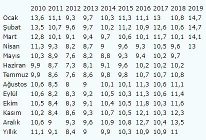 TÜİK verilerine göre, 2010-2019 döneminde aylar ve yıllar itibarıyla mevsim etkilerinden arındırılmamış işsizlik oranları şöyle: