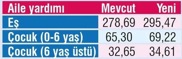 Böylece memurlar Temmuz'da 3 zamma birden kavuştu. Her ay ödenen ve çalışmayan eş için verilen yardım 278,69 liradan 295,44 liraya, çocuk yardımı da 0-6 yaş arası için 65,30 liradan 69,22 liraya, 6 yaş üstü çocuk için 32,65 liradan 34,61 liraya yükseldi.