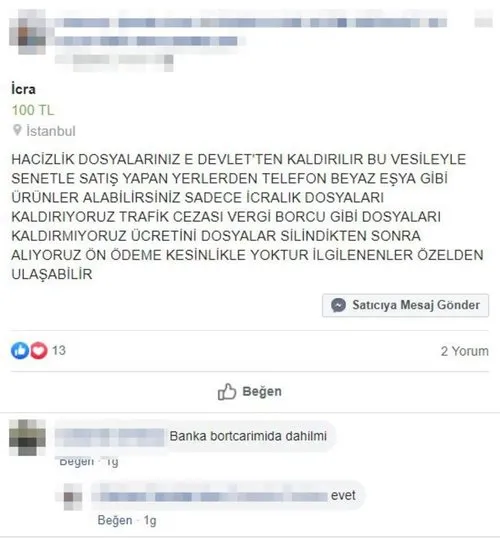 Milliyet'in haberine göre Facebook'ta verilen ilana göre, "Hacizlik dosyalarınız E-Devlet'ten kaldırılır. Bu vesileyle senetle satış yapan yerlerden telefon, beyaz eşya gibi ürünler alabilirsiniz. Sadece icralık dosyaları kaldırıyoruz. Trafik cezası, vergi borcu gibi dosyaları kaldırmıyoruz. Ücretini dosyalar silindikten sonra alıyoruz. Ön ödeme kesinlikle yoktur. İlgilenenler özelden ulaşabilir." açıklaması bulunuyor.