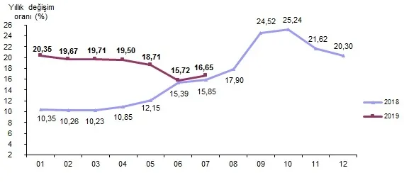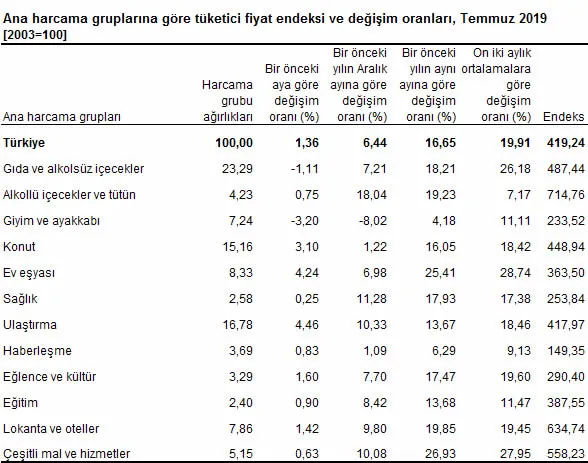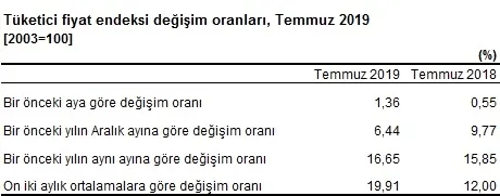 Tüketici fiyat endeksi (TÜFE) aylık %1,36 arttı. TÜFE'de (2003=100) 2019 yılı Temmuz ayında bir önceki aya göre %1,36, bir önceki yılın Aralık ayına göre %6,44, bir önceki yılın aynı ayına göre %16,65 ve on iki aylık ortalamalara göre %19,91 artış gerçekleşti.