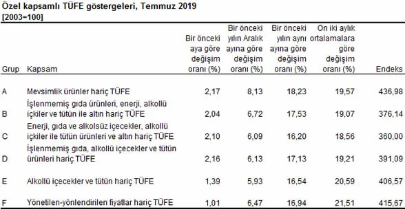 İşlenmemiş gıda ürünleri, enerji, alkollü içkiler ve tütün ile altın hariç TÜFE'de 2019 yılı Temmuz ayında bir önceki aya göre %2,04, bir önceki yılın Aralık ayına göre %6,72, bir önceki yılın aynı ayına göre %17,53 ve on iki aylık ortalamalara göre %19,07 artış gerçekleşti.