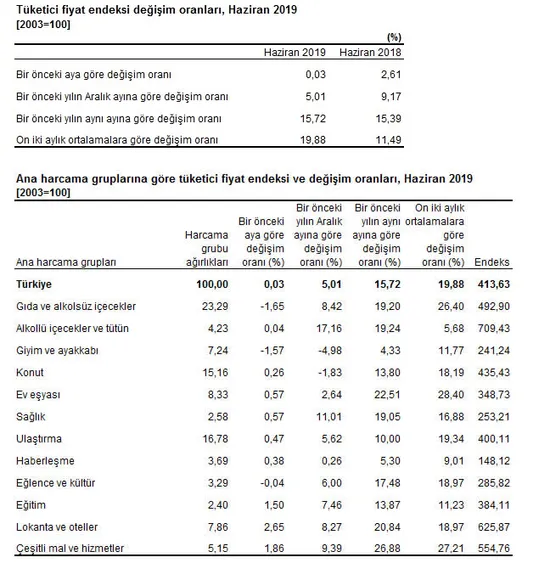 TÜFE'de (2003=100) 2019 yılı Haziran ayında bir önceki aya göre %0,03, bir önceki yılın Aralık ayına göre %5,01, bir önceki yılın aynı ayına göre %15,72 ve on iki aylık ortalamalara göre %19,88 artış gerçekleşti.