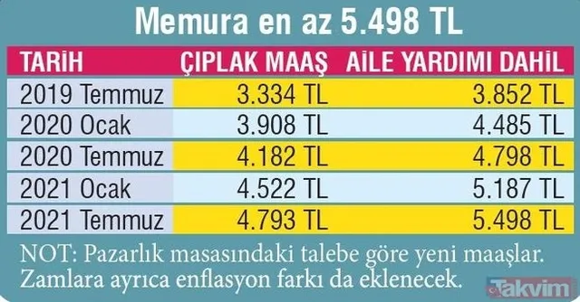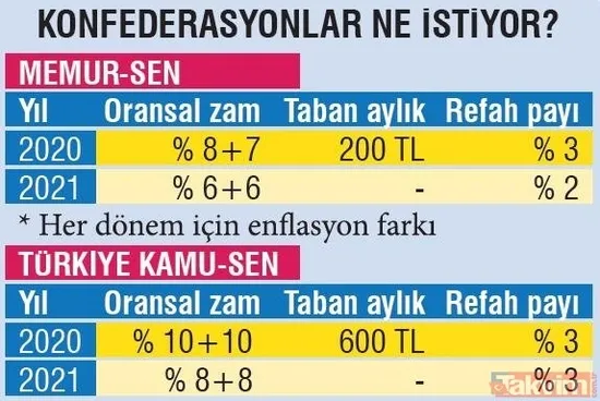 Memur-Sen, 2020'de yüzde 8 7 zam, taban aylıkta 200 lira artış ve yüzde 3 refah payı talep ediyor. Bu talep kabul görürse en düşük memur maaşı 3 bin 334 liradan Ocak'ta 3 bin 908, Temmuz'da 4 bin 182 liraya yükselecek. Evli, eşi çalışmayan ve 2 çocuklu en düşük memur maaşı ise 3 bin 852 liradan Ocak'ta 4 bin 485 liraya, Temmuz'da 4 bin 798 liraya ulaşacak. Bu ay içerisinde tamamlanacak görüşmelerde memurlar ve memur emeklileri için 4 seferde yani 6 aylık dönemler halinde yapılacak zam oranları belirlenecek. Ayrıca önümüzdeki 2 yılda memurların ve emeklilerin yararlanacağı mali ve sosyal haklar karara bağlanacak.