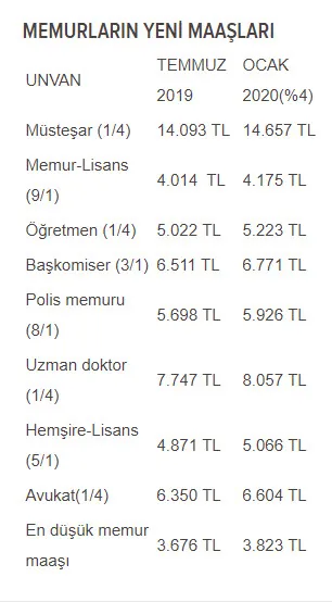 Şu anda 3 bin 676 lira olan en düşük memur maaşı da 2020 yılındaki zamla 3 bin 823 lira olacak. 147 lira zamlanacak en düşük memur maaşına enflasyon oranına göre enflasyon farkı da ödenecek.