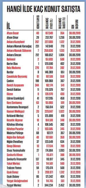 Şu anda dar gelirli vatandaşlar için 26 şehirde, toplam 2 bin 395 konut açık satışta bulunuyor. Bu konutlar için son başvuru tarihi 30 Eylül ve 31 Aralık olarak iki gruba ayrılıyor. 350 liradan başlayan taksitlerle ev sahibi olma şansı sunan bu konutların fiyatları 104 bin 518 lira ile 344 bin 234 lira arasında değişiyor.