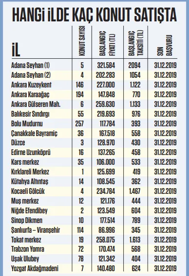 Dar gelirli vatandaşlar için, 26 şehirde toplam 2 bin 395 konut açık satışta bulunuyor. Bu konutlar için son başvuru tarihi 31 Aralık olarak belirtilmiş. 345 liradan başlayan taksitlerle ev sahibi olma şansının sunulduğu bu konutların fiyatları 104 bin 518 ile 344 bin 234 lira arasında değişiyor.