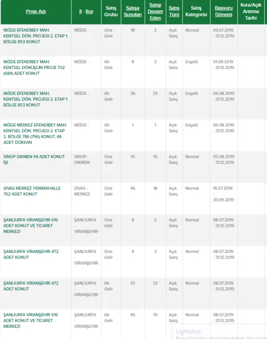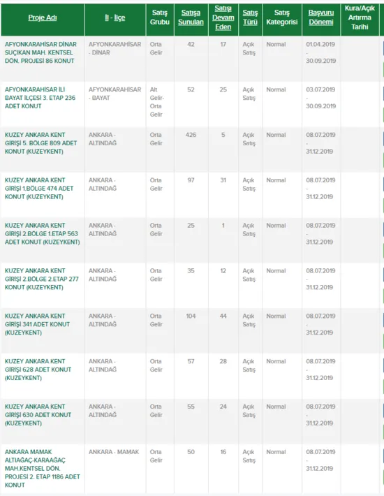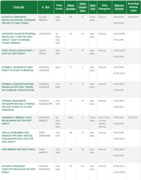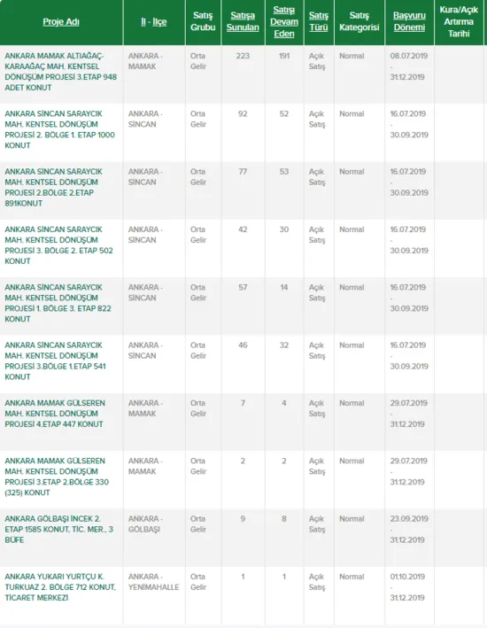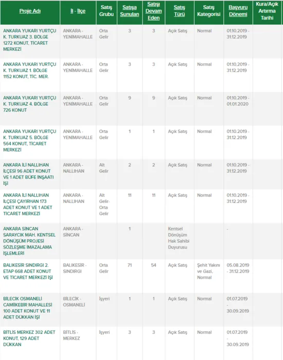 Ödeme seçenekleri ise 15, hatta 20 seneye kadar uzanıyor. Satıştaki konutlar için peşinat oranları, projeye göre yüzde 10, 12, 15, 20, 25 olarak farklılık gösteriyor. Ödenen peşinata göre vade de uzuyor. Vade süreleri de projeye göre 96, 108, 120, 180, 216 ve 240 ay olarak belirlendi. Açık satışlardan dar gelirli vatandaşlar, emekliler ve şehit aileleri faydalanabiliyor.