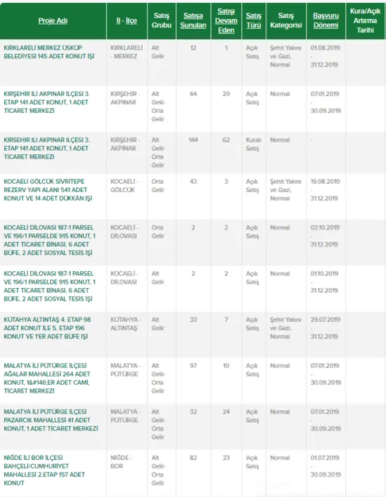 Dar gelirli vatandaşlar için, 26 kentte toplam 2 bin 395 konut açık satışta bulunuyor. Bu konutlar için son başvuru tarihi 31 Aralık 2019 olarak belirtilmiş. 345 liradan başlayan taksitlerle ev sahibi olma şansının sunulduğu bu konutların fiyatları 104 bin 518 ile 344 bin 234 lira arasında farklılık gösteriyor.