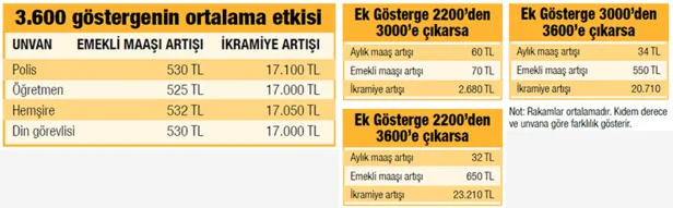 Memurların maaş hesabında kullanılan ölçütlerden birisi olan ek gösterge rakamları unvan, hizmet sınıfı ve derecelere göre farklılık gösteriyor. Ek göstergesi 3600 olan bir memur ile daha düşük olan bir memurun alacağı maaş miktarı aynı olmuyor. Kıdem ve dereceye göre değişmesine rağmen ortalama olarak polislerde emekli maaşı 530 lira ikramiye ise 17 bin 100 lira artacak. Öğretmenlerde de en az emekli maaşı artışı 500 lira olacak ve ikramiyelerdeki artış 13 bin lirayı geçecek. Ek göstergesi 2200'den 3600'e çıkacak personelde ikramiye artışı 20 bin lirayı geçecek.