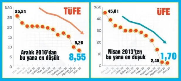 Hazine ve Maliye Bakanı Berat Albayrak, Ekim ayı enflasyon verilerini sosyal medya hesabından değerlendirdi. Enflasyonla mücadelede atılan adımların meyvelerini vermeye devam ettiğini vurgulayan Albayrak, "Ekim ayı rakamlarıyla TÜFE'de son 3 yılın en düşük enflasyon seviyelerini yakaladık. Enflasyonla mücadelede aynı kararlı duruşu sürdürecek ve yıl sonunda hedeflediğimiz oranları tutturacağız" değerlendirmesi yaptı. Albayrak'ın paylaşımında yer alan infografikte de "Para ve maliye politikalarının güçlü eş güdümüyle ana mücadele alanlarının başında gelen enflasyonda 2019 yılının Eylül ve Ekim aylarında ulaşılan seviyeler, ekonomide dengelenme sürecinin başarılı birer örneğini oluşturmaya devam ediyor" ifadesi yer aldı. İnfografiğe göre; Ekim'de yıllık TÜFE'de Aralık 2016'dan, yıllık ÜFE'de Nisan 2013'ten beri en düşük seviye yakalandı.