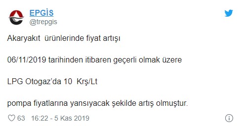 Enerji Petrol Gaz İkmal İstasyonları İşveren Sendikası'nın (EPGİS) sosyal medya hesabından paylaştığı bilgiye göre otogazın litre satış fiyatında bu geceyarısından itibaren geçerli olacak şekilde 10 kuruş fiyat artışı yapılacak. Otogazın litresi İstanbul'da ortalama 3,87 liraya, Ankara'da 3,98 liraya, İzmir'de 3,90 liraya yükselecek.