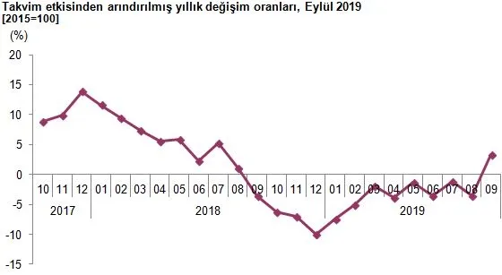 Takvim etkisinden arındırılmış sanayi üretimi 2019 yılı üçüncü çeyreğinde bir önceki yılın aynı çeyreğine göre %0,4 azaldı. Bir önceki çeyreğe göre mevsim ve takvim etkilerinden arındırılmış sanayi üretimi ise %1,6 arttı.