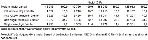 Teknoloji yoğunluğuna göre dış ticaret verileri, ISIC Rev.3 sınıflaması içinde yer alan imalat sanayi ürünlerini kapsamaktadır. Ekim ayında ISIC Rev.3'e göre imalat sanayi ürünlerinin toplam ihracattaki payı %93,2'dir. Yüksek teknoloji ürünlerinin imalat sanayi ürünleri ihracatı içindeki payı %3,9'dur. İmalat sanayi ürünlerinin toplam ithalattaki payı %78,5'tir. Ekim ayında yüksek teknoloji ürünlerinin imalat sanayi ürünleri ithalatı içindeki payı %16,2'dir.