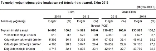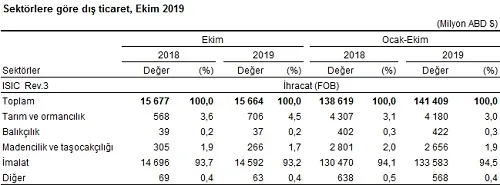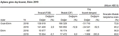 Türkiye İstatistik Kurumu ile Ticaret Bakanlığı işbirliğiyle oluşturulan geçici dış ticaret verilerine göre; ihracat 2019 yılı Ekim ayında, 2018 yılının aynı ayına göre %0,1 azalarak 15 milyar 664 milyon dolar, ithalat %8 artarak 17 milyar 472 milyon dolar olarak gerçekleşti.