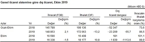 Genel ticaret sistemine göre ihracat 2019 yılı Ekim ayında bir önceki yılın aynı ayına göre %1,5 azalarak 16 milyar 338 milyon dolar, ithalat ise %10,8 artarak 18 milyar 177 milyon dolar olarak gerçekleşti. Söz konusu ayda ihracatın ithalatı karşılama oranı %89,9 oldu.