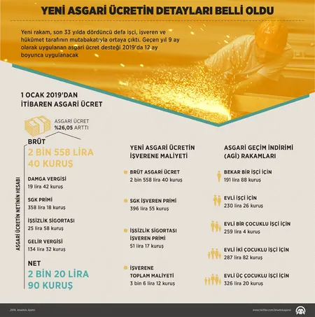 Asgari ücret ve AGİ zammı ile ilgili kritik zaman geldi. 7 milyona yakın çalışanı ilgilendiren asgari ücret görüşmeleri; Aile, Çalışma ve Sosyal Hizmetler Bakanlığının ev sahipliğinde başlayacak. Bakan Zehra Zümrüt Selçuk'un başkanlığında toplanacak komisyonda, işçi tarafını Türkiye İşçi Sendikaları Konfederasyonu (Türk-İş), işveren tarafını ise Türkiye İşveren Sendikaları Konfederasyonu (TİSK) temsil edecek. 2019 yılı için uygulanan asgari ücret brüt 2.558,40 lira, net 2.020.90 lira; bu rakama, 191.88 liralık asgari geçim indirimi dahil.