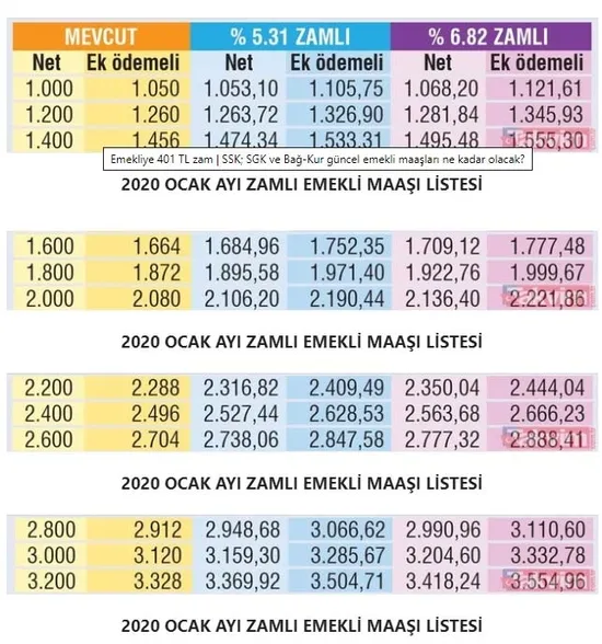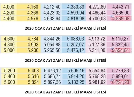 Emekli maaşının 2020 yılında ne kadar olacağı binlerce kişi tarafınca merakla araştırılmaya devam ediyor. Peki, emekli maaşlarına ne vakit zam yapılacak? İşte emekli maaşı sıralaması! Ocak'ta ayrıca ek ödeme tutarları da yükselecek. Maaşın yüzde 4'ü-5'i oranında olan ek ödeme, yeni aylıktan hesaplanacağı için artacak. Yüzde 6.82 artışa nazaran SSK ve Bağ-Kur emeklilerinin ek ödeme dahil gelirinde 80,61 ile 401,5 lira arasında artış yaşanacak.
