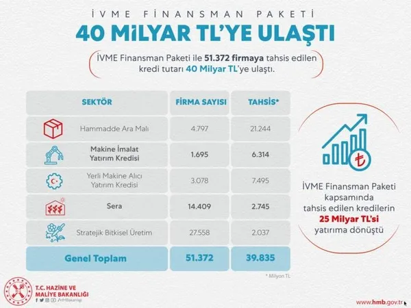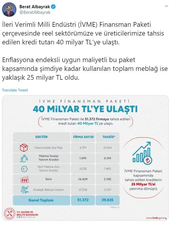 Hazine ve Maliye Bakanı Berat Albayrak, "İleri Verimli Milli Endüstri (İVME) Finansman Paketi çerçevesinde reel sektörümüze ve üreticilerimize tahsis edilen kredi tutarı 40 milyar liraya ulaştı." ifadesini kullandı.