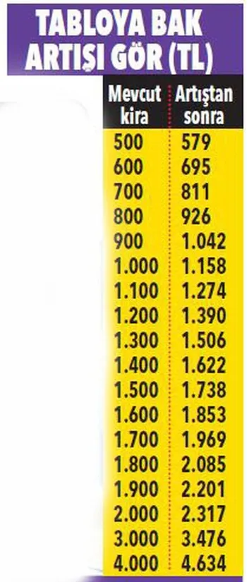 Mevcut kira bedeli 500 TL Olanlar İçin zam oranı 91,35 lira, kirası 750 TL olanlar için zam oranı 137,03 lira kirası 1.000 TL olanlar için zam oranı 182.70 lira olarak hesaplanıyor.
