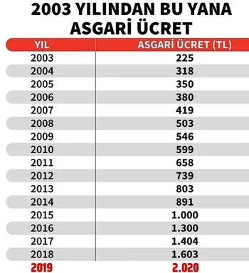 2019 Asgari ücret: 2.020 TL yüzde 15 zam yapılması ile 303 TL zam yapılmış olacak bu da asgari ücretin 2 bin 323 TL olması anlamına geliyor.