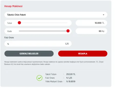 Ziraat Bankası kurumsal internet sitesi üzerinden "Hesap Makinesi" programını kullanarak, kullanmak istediğiniz kredi tutarına göre aylık ödemeniz gereken taksitleri ve toplam ödeme tutarını önceden görüntüleyebilirsiniz. Bunun yanı sıra kullanılan tüketici kredisi tutarına göre değişiklik gösteren en cazip faiz oranlarından da yararlanabilirsiniz.