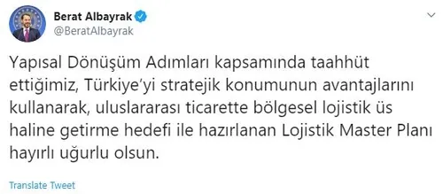 Bakan Albayrak: Yapısal Dönüşüm Adımları kapsamında taahhüt ettiğimiz, Türkiye’yi stratejik konumunun avantajlarını kullanarak, uluslararası ticarette bölgesel lojistik üs haline getirme hedefi ile hazırlanan Lojistik Master Planı hayırlı uğurlu olsun.