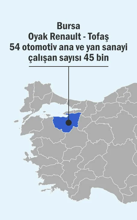 TOGG'un da özellikle talep ettiği Bursa otomotivin başkenti olarak da ifade ediliyor. Tofaş ve Renault'un üretim tesislerinin yer aldığı ilde Türkiye'de üretilen 15 modelin 9'u üretiliyor. OYAK Renault Bursa fabrikası yıllık 360 bin otomobil, Tofaş ise 450 bin araçlık üretim kapasitesine sahip. Ayrıca bölgede Otomotiv Test Merkezi de kuruluyor.
