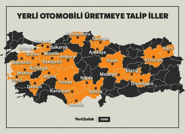 Yerli otomobilin kendi illerinde üretilmesi için arazi, elektrik, su ve altyapı desteğinin yanı sıra çalıştırılacak personelin eğitimine kadar pek çok ekstra avantajı sunacağını ilan eden 26 il oldu.