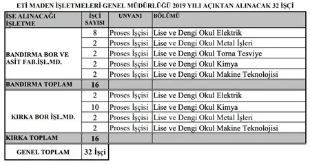 Bu bağlamda, Bandırma Bor ve Asit Fabrikaları İşletme Müdürlüğüne (Bandırma/BALIKESİR) de 16 işçi ve Kırka Bor İşletme Müdürlüğüne (Seyitgazi/ESKİŞEHİR) 16 olmak üzere toplam 32 sürekli işçi için alım yapılacak.