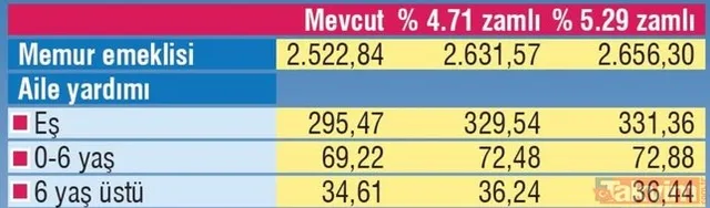 Bu artış; aile yardımı, emekli doktorların ek ödemesi, evde bakım desteği, 65 yaş aylığı ve engelli aylığını da yükseltecek. Aile yardımı hariç en düşük memur aylığı 3 bin 334 liradan 3 bin 510 liraya, eşi çalışmayan, 6 yaş altı 2 çocuğu olanın aile yardımı 433 liradan 477 liraya çıkabilecek.
