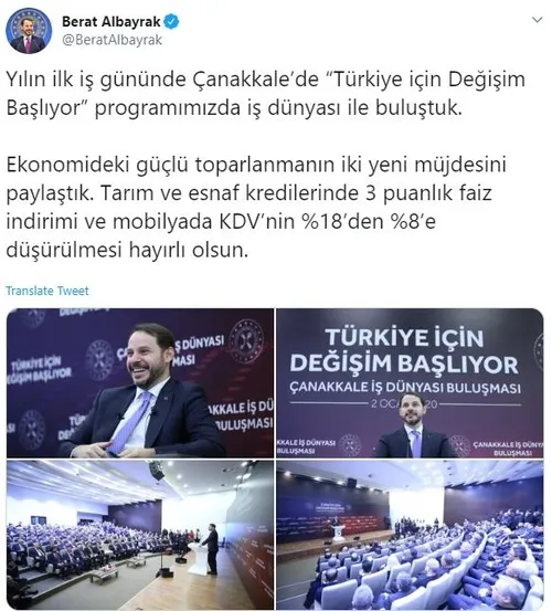 Çanakkale Ticaret ve Sanayi Odası Konferans Salonunda 'Türkiye İçin Değişim Başlıyor' buluşmaları kapsamında gerçekleştirilen programa Çanakkale Valisi Orhan Tavlı, Vakıfbank Genel Müdürü Abdi Serdar Üstünsalih, Halkbankası Genel Müdürü Osman Arslan, Ziraat Bankası Genel Müdürü Hüseyin Aydın, Gelir İdaresi Başkanı Bekir Bayrakdar, ÇTSO Başkanı Selçuk Semizoğlu, AK Parti Çanakkale İl Başkanı Naim Makas, banka müdürleri ve iş adamları katıldı. Programda yaptığı konuşmada yeni yılın ilk müjdelerini veren Bakan Albayrak, "Malumunuz en son geçtiğimiz hafta sıfır konutlarda faiz oranlarını yüzde 0.99'dan 0.79'a çekmiştik. Bu inşaat sektöründe, yan sanayiyi çok olumlu etkileyecek noktalardan bir tanesi. İnşallah bugün de tarım ve turizm şehri Çanakkale'de güzel bir bilgiyi, güzel bir müjdeyi çiftçilerimizle ve esnaflarımızla paylaşmak istiyorum. Malumunuz kamu bankalarımız esnaf kredileri ile tarımsal kredi faizlerini artık yeni yıl itibariyle yıllık yüzde 12'den yüzde 9'a düşürdü. Halihazırda tarımsal kredilerdeki yüzde 25 ile yüzde 100 oranındaki hazinemiz tarafından faiz sübvansiyonu uygulandığından dolayı bu oran ortalama yüzde 5'in de altına düşecek. Yüzde 6'lar, 7'ler değil, artık yüzde 5, yüzde 4,5 sıfıra kadar ineceği bir noktada ve özellikle tarımsal kredilerde yüzde 6'lı faizin de yüzde sıfır ila 4 buçuk aralığına gerileyeceğini buradan müjdelemek istiyorum" ifadelerini kullandı.