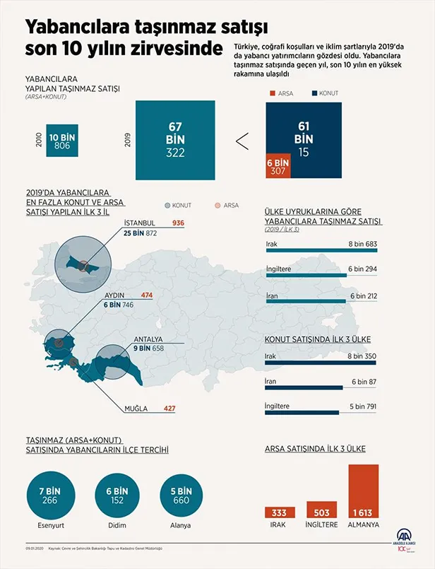 Türkiye, coğrafi koşulları ve iklim şartlarıyla 2019'da da yabancı yatırımcıların gözdesi oldu. Yabancılar 2010'da 10 bin 806 mülk edinirken, bu sayı geçen yıl 67 bin 322 olarak kayıtlara geçti. 63 bin 986 yabancı, 2019 yılında Türkiye'den 6 bin 307 arsa, 61 bin 15 konut satın aldı.