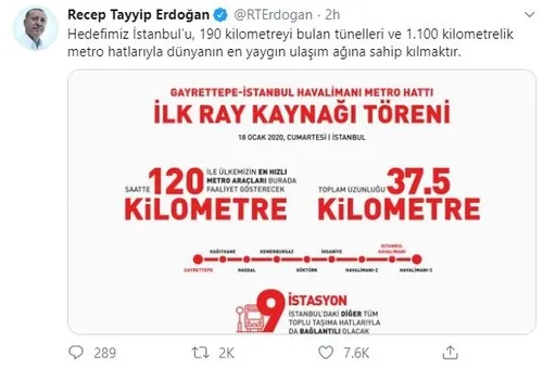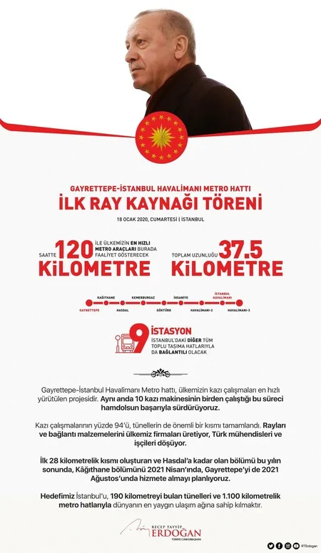 Başkan Recep Tayyip Erdoğan, sosyal medya hesabından, bugün ilk ray kaynağı töreni gerçekleştirilen Gayrettepe-İstanbul Havalimanı Metro Projesi'ne ilişkin paylaşımda bulundu.