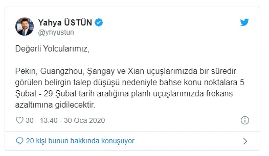 Türk Hava Yolları Basın Müşaviri Yahya Üstün Twitter'dan "Pekin, Guangzhou, Şangay ve Xian uçuşlarımızda bir süredir görülen belirgin talep düşüşü nedeniyle bahse konu noktalara 5 Şubat - 29 Şubat tarih aralığına planlı uçuşlarımızda frekans azaltımına gidilecektir." açıklamasında bulundu.