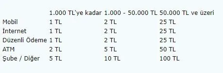 Yeni düzenleme ile işlem tutarlarına göre farklı ödeme kanalları bazında bankalarca alınacak EFT ücretleri şöyle: