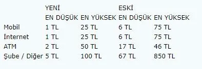 Bu sınırlar sırasıyla, işlem tutarının 1.000 lira ila 50 bin lira arasında olması halinde 2 lira, 5 lira ve 10 lira düzeyinde, işlem tutarının 50 bin liranın üzerinde bulunması durumunda ise 25 lira, 50 lira ve 100 lira şeklinde uygulanacak.