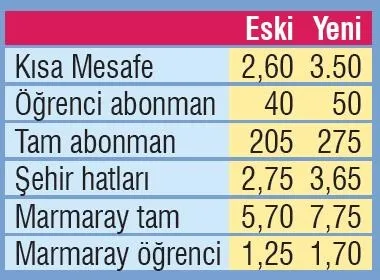 CHP'nin İstanbul Büyükşehir Belediye Başkanı Ekrem İmamoğlu, düşüreceğim dediği tüm ödemelere zam yapıyor. İETT otobüsleri, metro ve metrobüslere yapılan yüzde 35 zam dün yürürlüğe girerken bunlara Marmaray ve deniz hatları da eklendi. Şehir Hatları Adalar Hattı'nda tam bilet ücret tarifesi 5,20 liradan 10 liraya çıktı. Marmaray'da kısa mesafe 2,60 liradan 3,50 liraya, tam parkur ücreti 5,70 liradan 7,75 liraya yükseldi.