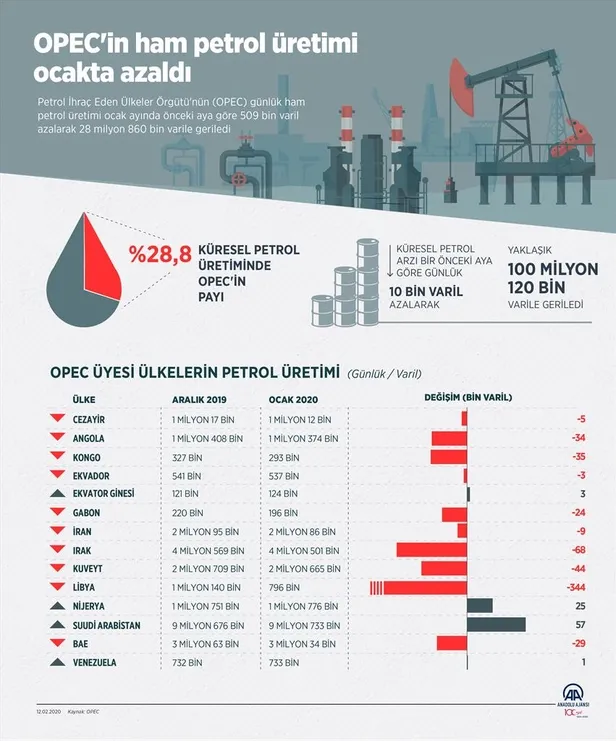 OPEC'in 2020'nin Ocak ayına ilişkin petrol piyasası raporuna göre, geçen ay küresel petrol arzı bir önceki aya kıyasla günlük 10 bin varil azalarak yaklaşık 100 milyon 120 bin varile düştü.