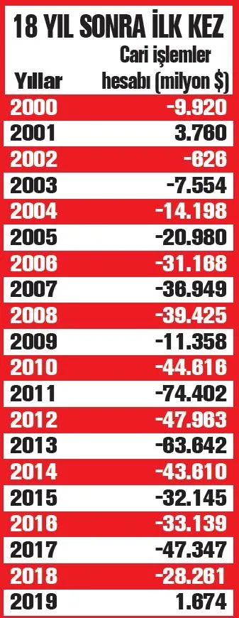 KUR saldırısının ardından ekonomide dengelenmenin yaşandığı 2019'da tarihi bir performansa imza Türkiye, cari fazlada da rekor kırdı. Cari işlemler hesabı 2019'da 1 milyar 674 milyon dolar fazla verdi. Böylece 2001 yılından bu yana ilk defa ve en yüksek cari fazla verilmek suretiyle yıl tamamlandı. Ekonomistler yıllar sonra 2019'da cari fazla verilmesinde ithalatın yıllık yüzde 9.1 daralmasının, ihracatın yüzde 2.1 artışının ve turizm gelirindeki yüzde 17 yükselişin etkili olduğunu belirtti. Hazine ve Maliye Bakanı Berat Albayrak, 2019 yılı dengelenme döneminin başarısının cari denge rakamları ile ortaya çıkmış olduğunu belirtip, şunları söyledi:
