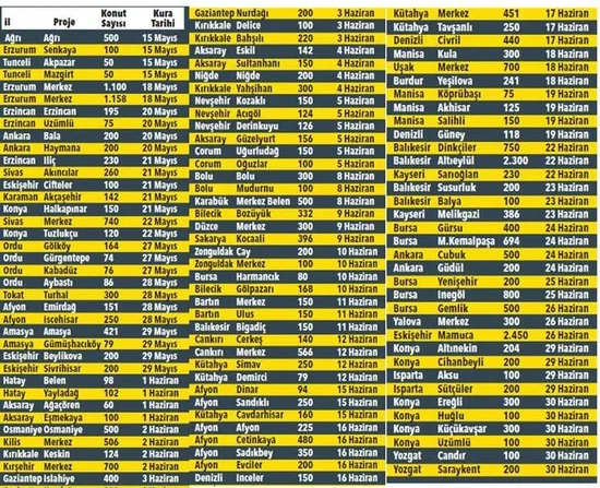 İstanbul'da talep toplanan 3 projedeki 10 bin konutun ilk kurası, Tuzla'da 117 bin 650 başvurunun yapıldığı 5 bin 750 konut için yapılacak. Kura töreni, 16 Mart'ta gerçekleştirilecek. Arnavutköy'deki 3 bin 750 konut için 18 Mart, Başakşehir'deki 500 konut için de 20 Mart tarihinde kura çekimi yapılacak. Ankara'da 7 projenin kuraları, 6 Mart'ta başlayacak. İlk kura bu tarihte Sincan'daki 2 bin 300 konut için çekilecek. Bursa Yıldırım projesinde 9 Mart, Gaziantep Şahinbey projesinde de 30 Mart tarihinde kura töreni var.