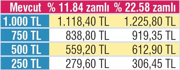 Dul yetimlerde ise örneğin; ölüm aylığı oranı yüzde 50 olan kişiye 500 lira yerine 559,20 ya da 612,90 lira, yüzde 25 olana 250 lira yerine 279,60 ya da 306,45 lira ödenebilecek.