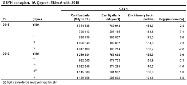 Üretim yöntemiyle Gayrisafi Yurt İçi Hasıla tahmini, 2019 yılının dördüncü çeyreğinde cari fiyatlarla bir önceki yılın aynı çeyreğine göre %17,0 artarak 1 trilyon 189 milyar 855 milyon TL oldu. GSYH'nin dördüncü çeyrek değeri cari fiyatlarla ABD doları bazında 205 milyar 692 milyon olarak gerçekleşti.