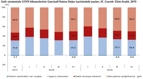İşgücü ödemelerinin cari fiyatlarla Gayrisafi Katma Değer içerisindeki payı geçen yıl %33,8 iken bu oran 2019 yılında %35,1 oldu. Net işletme artığı/karma gelirin payı ise %48,7'den %47,0'ye düştü.