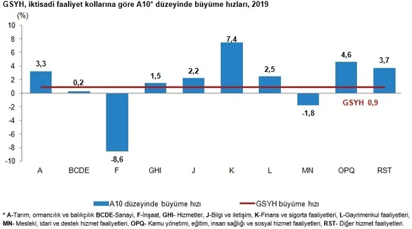 GSYH'yi oluşturan faaliyetler incelendiğinde; 2019 yılında bir önceki yıla göre zincirlenmiş hacim endeksi olarak; finans ve sigorta faaliyetleri toplam katma değeri %7,4, kamu yönetimi, eğitim, insan sağlığı ve sosyal hizmet faaliyetleri %4,6, diğer hizmet faaliyetleri %3,7 ve tarım sektörü %3,3 arttı. İnşaat sektörü %8,6, mesleki, idari ve destek hizmet faaliyetleri ise %1,8 azaldı.